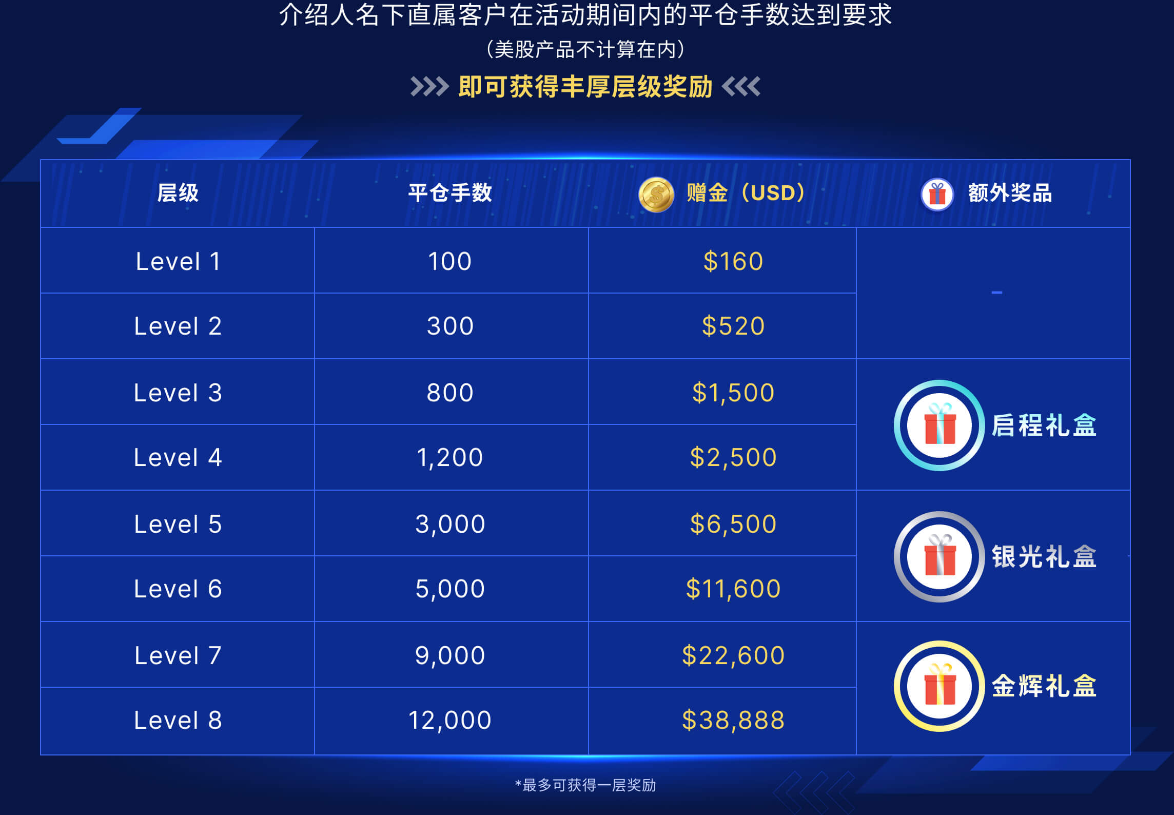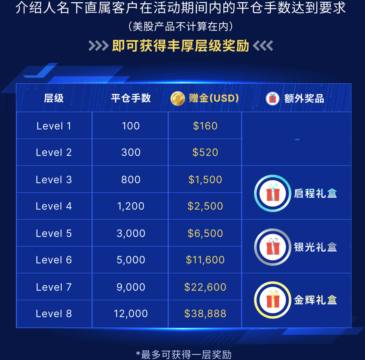 活动内容:介绍人在登记活动后,其名下的直属客户在活动期间达到平仓手要求即可获得相应的赠金。如达到Level3或以上层级的介绍人可获得额外奖品。