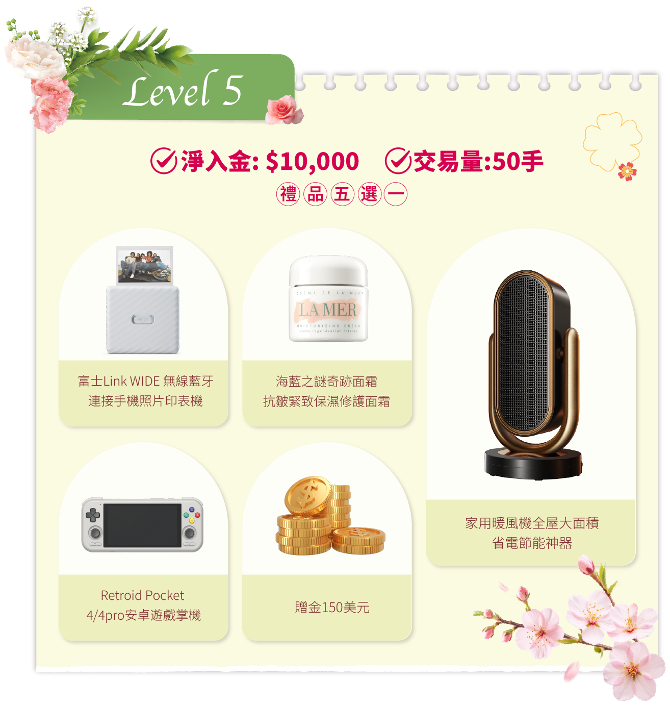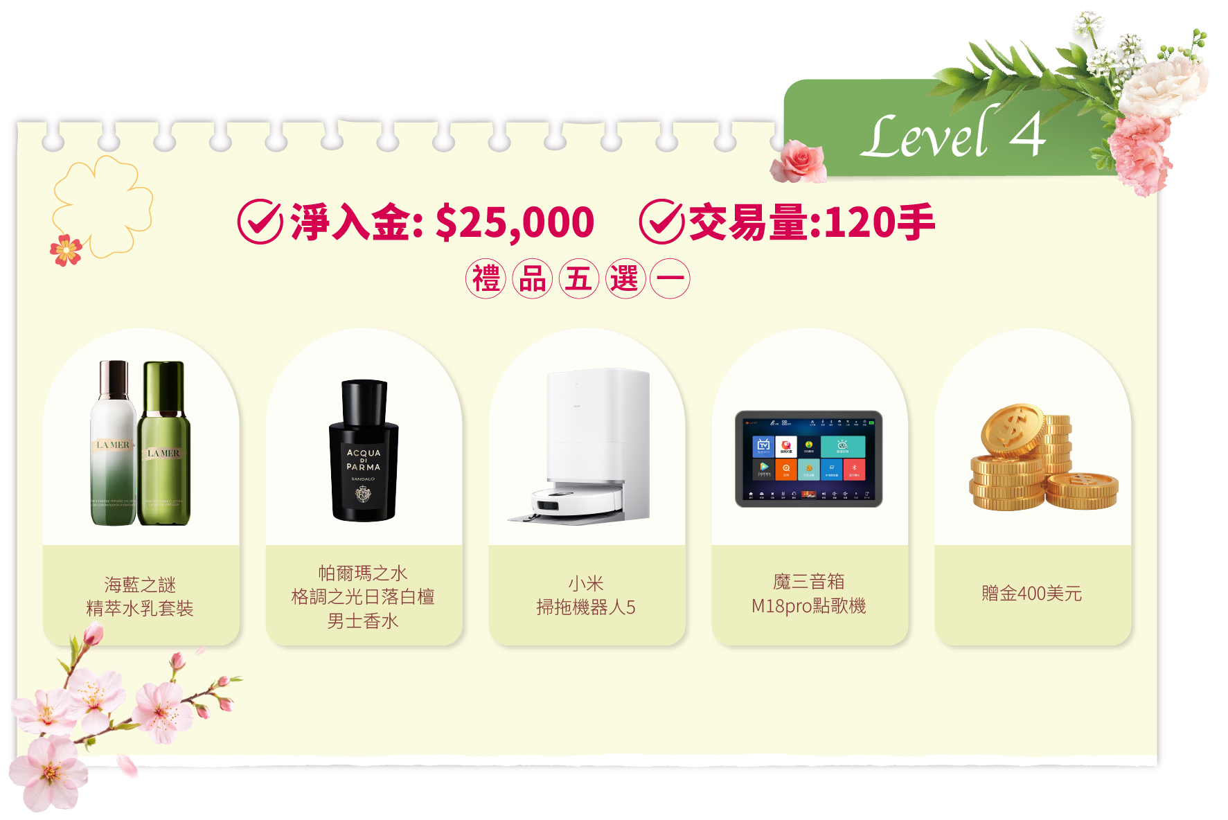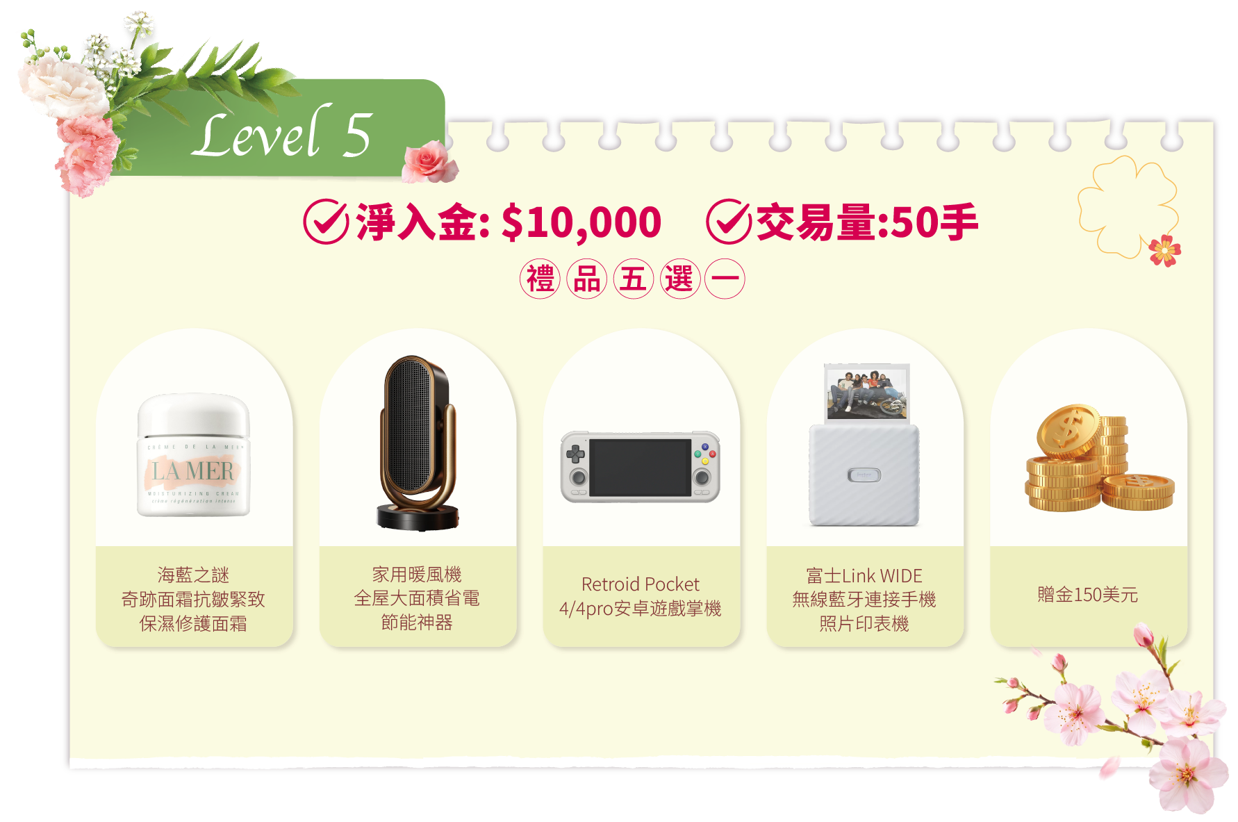 在活動期間內,客戶的淨入金和平倉手數(美股產品不計算在內)達到相應要求,即可在該層級的五件精選禮品中任選其一。若通過亨達APP完成交易,平倉手數將享有 三倍累计计算,助您更快达成目标!