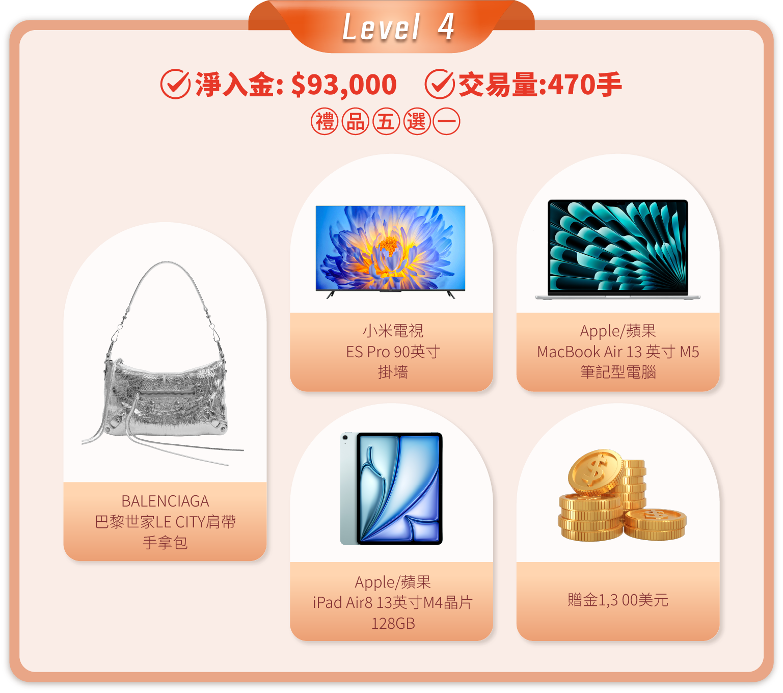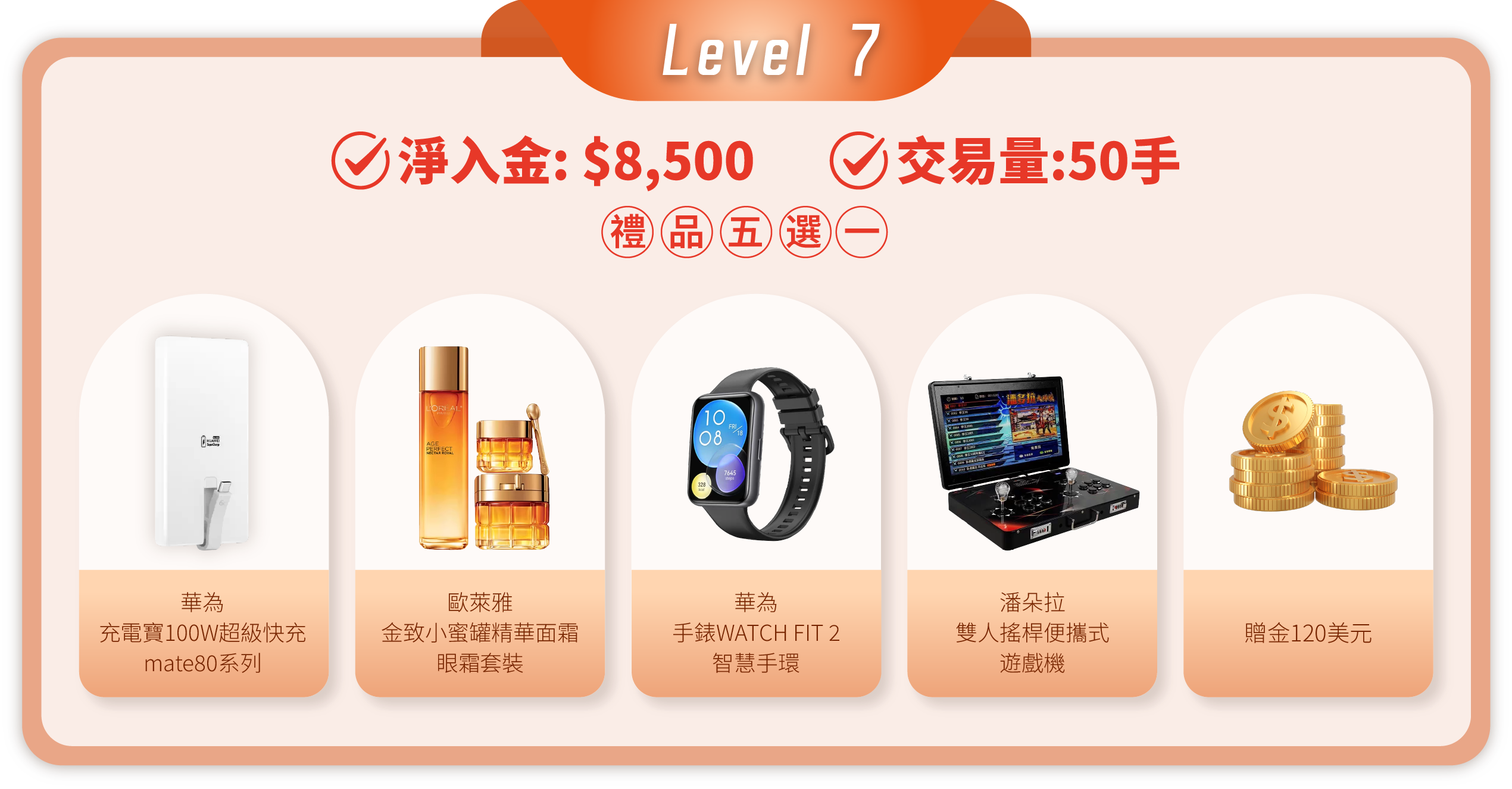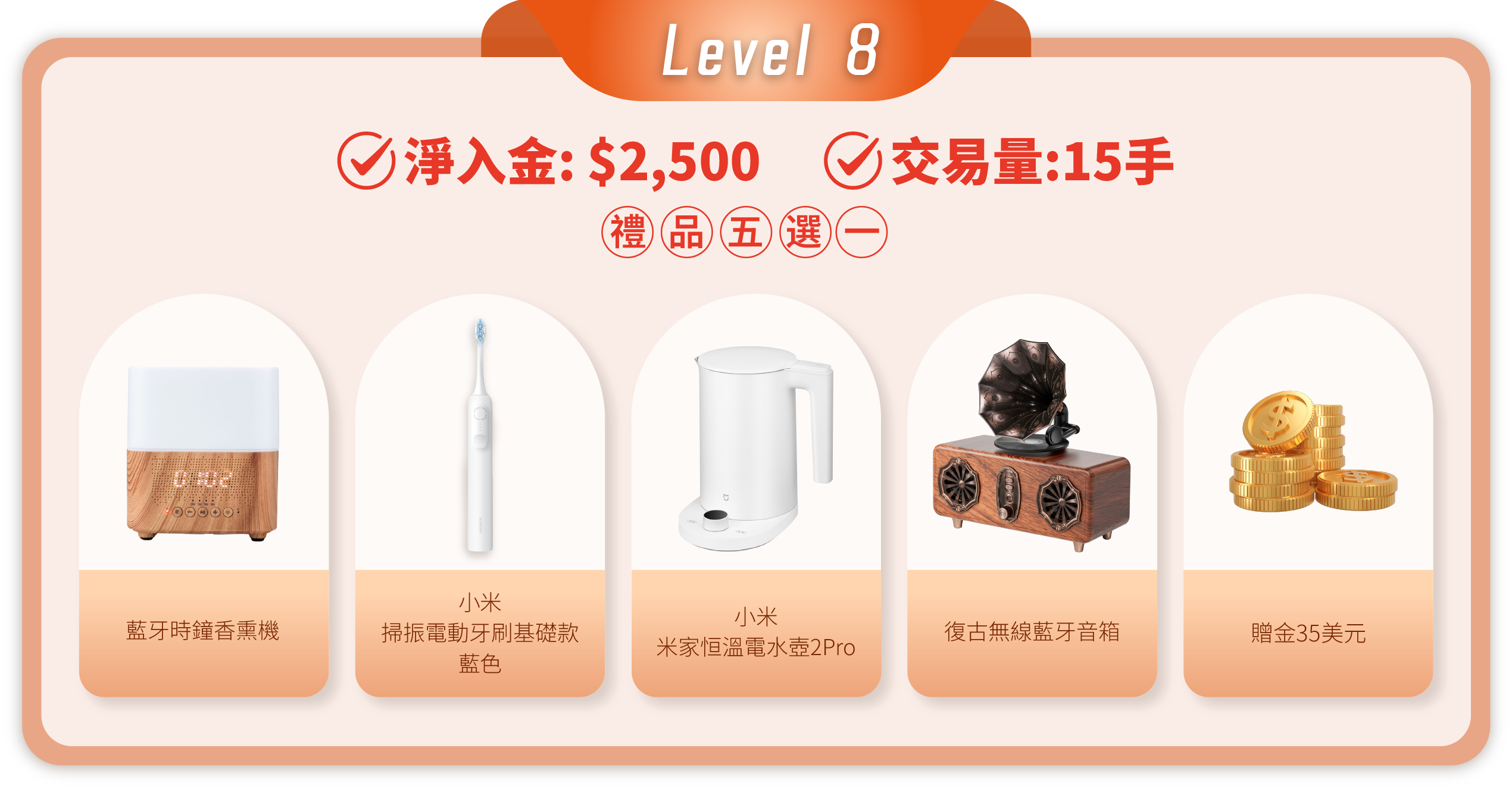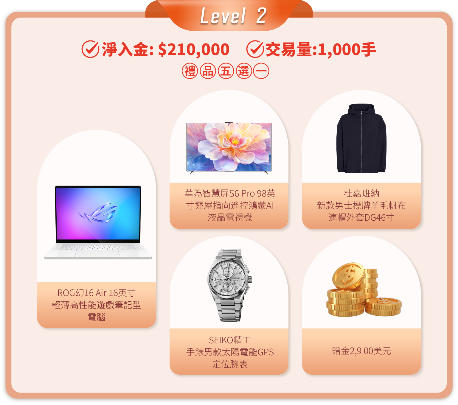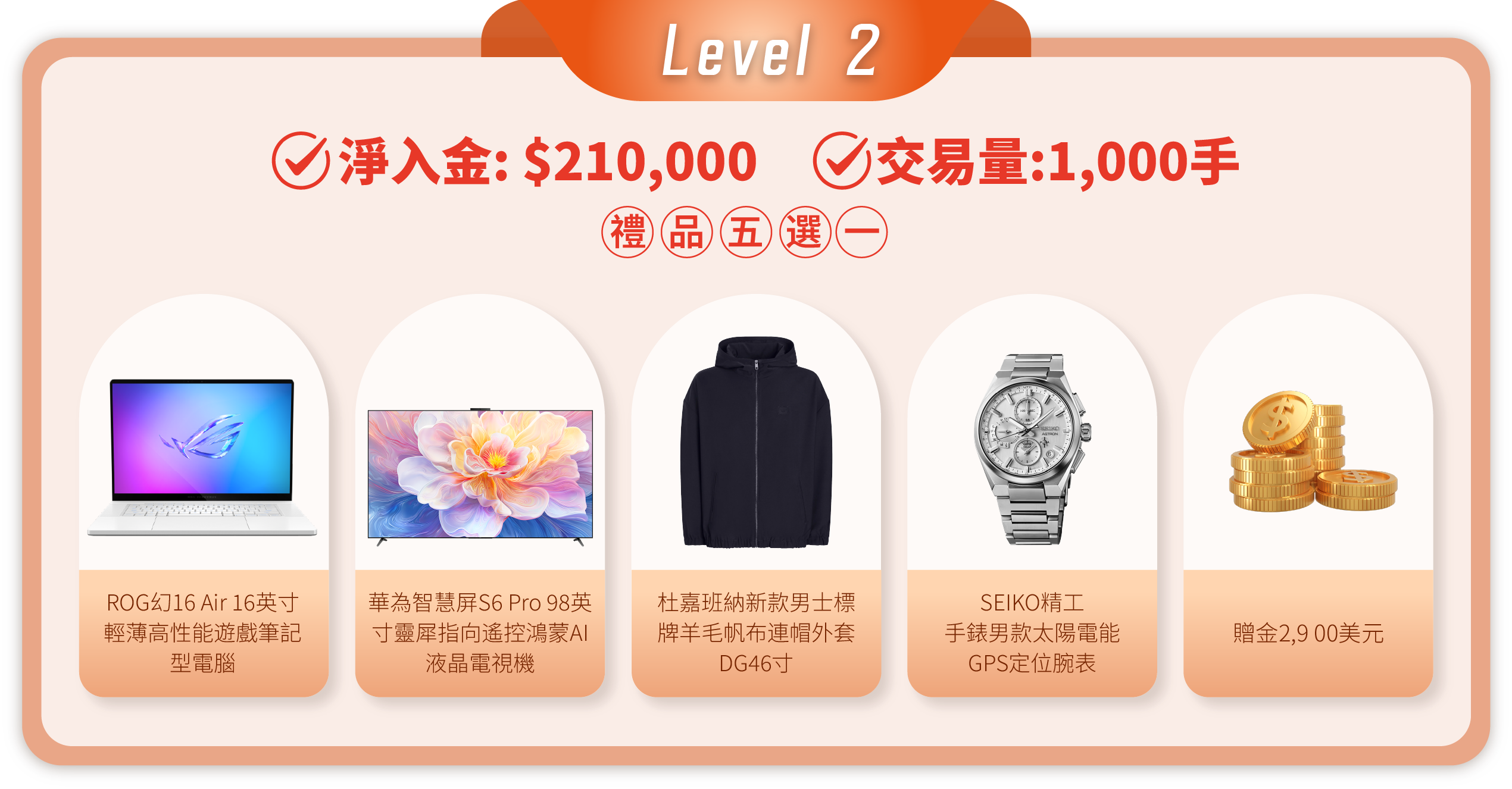 在活動期間內,顧客的淨入金和平倉手數(美股產品不計算在內)達到相應要求,即可在該層級的五件精選禮品中任選其一。層級越高,禮品越豐富!