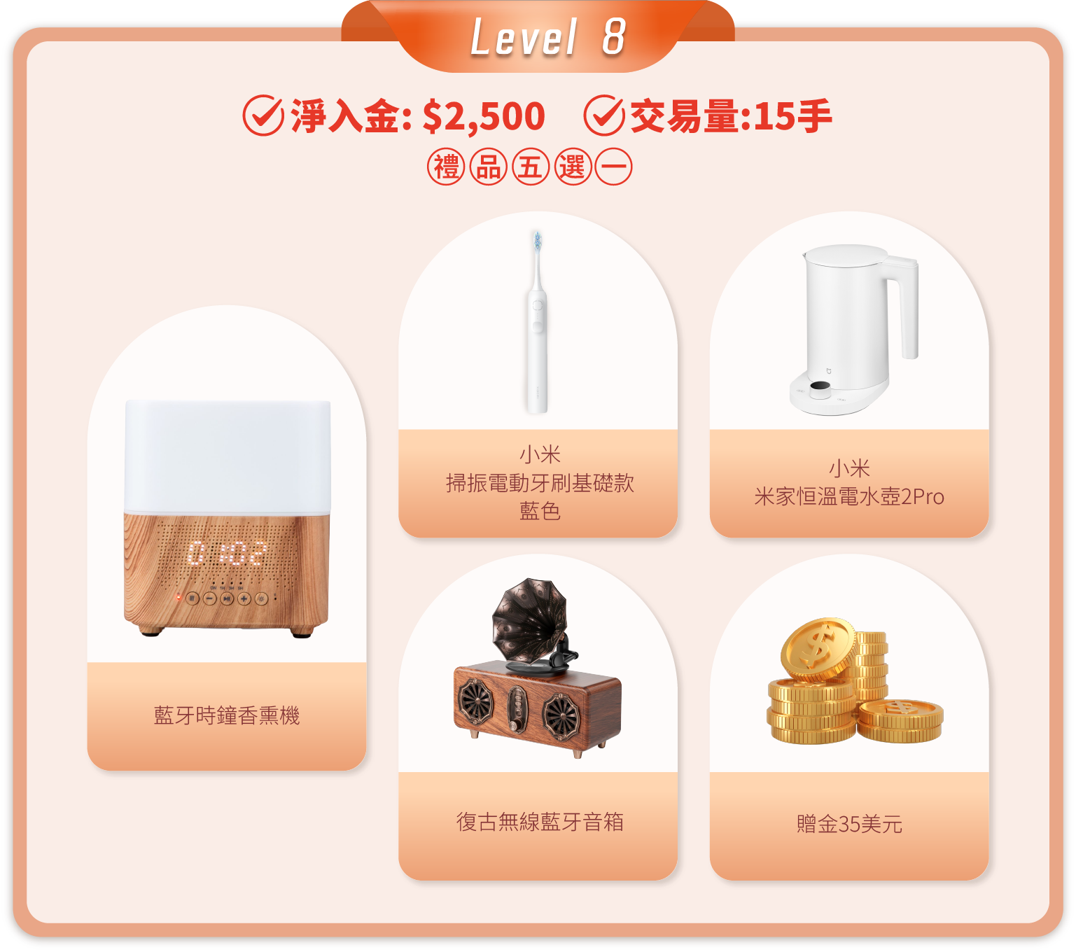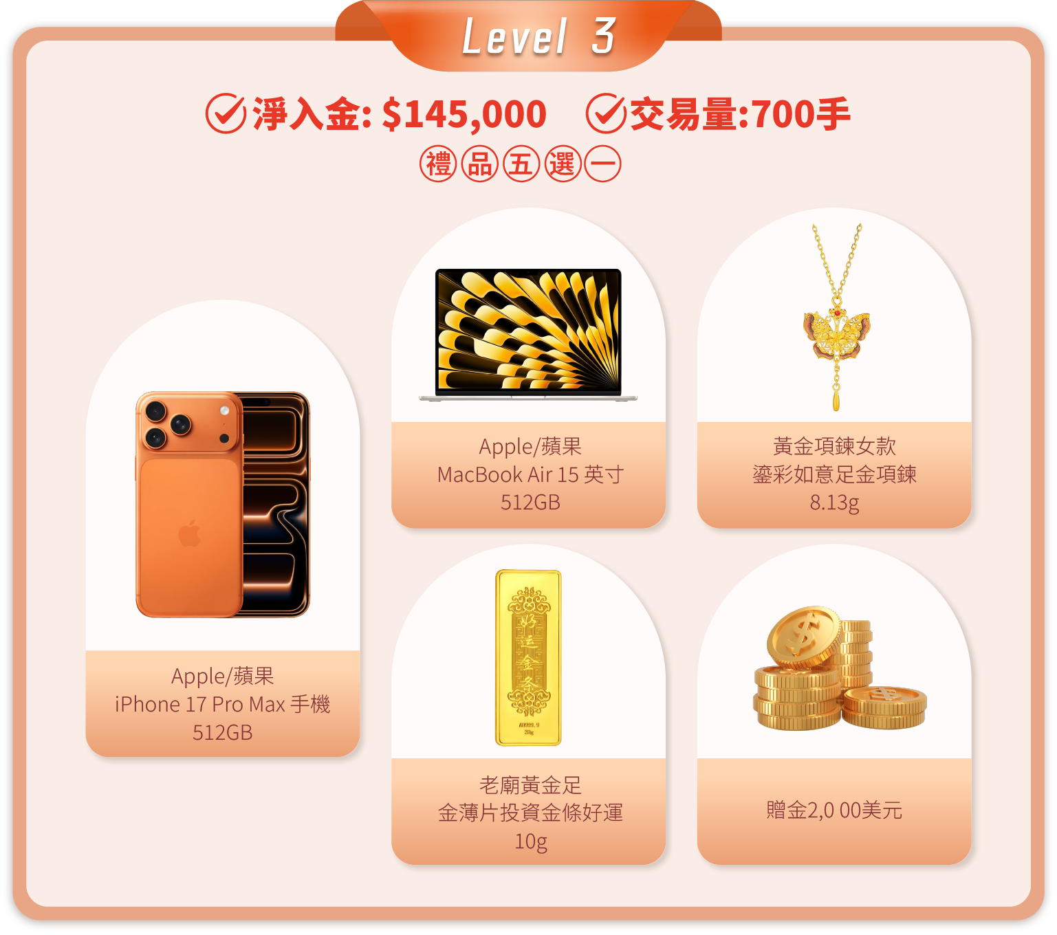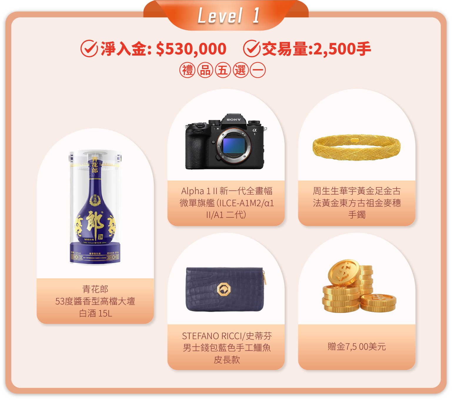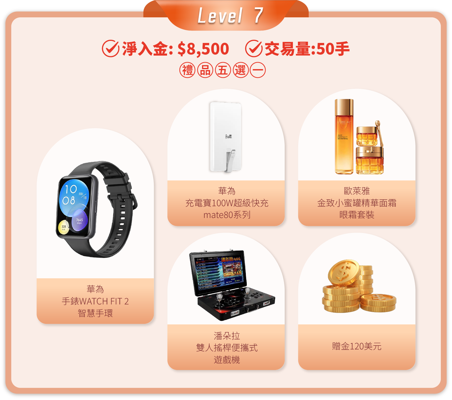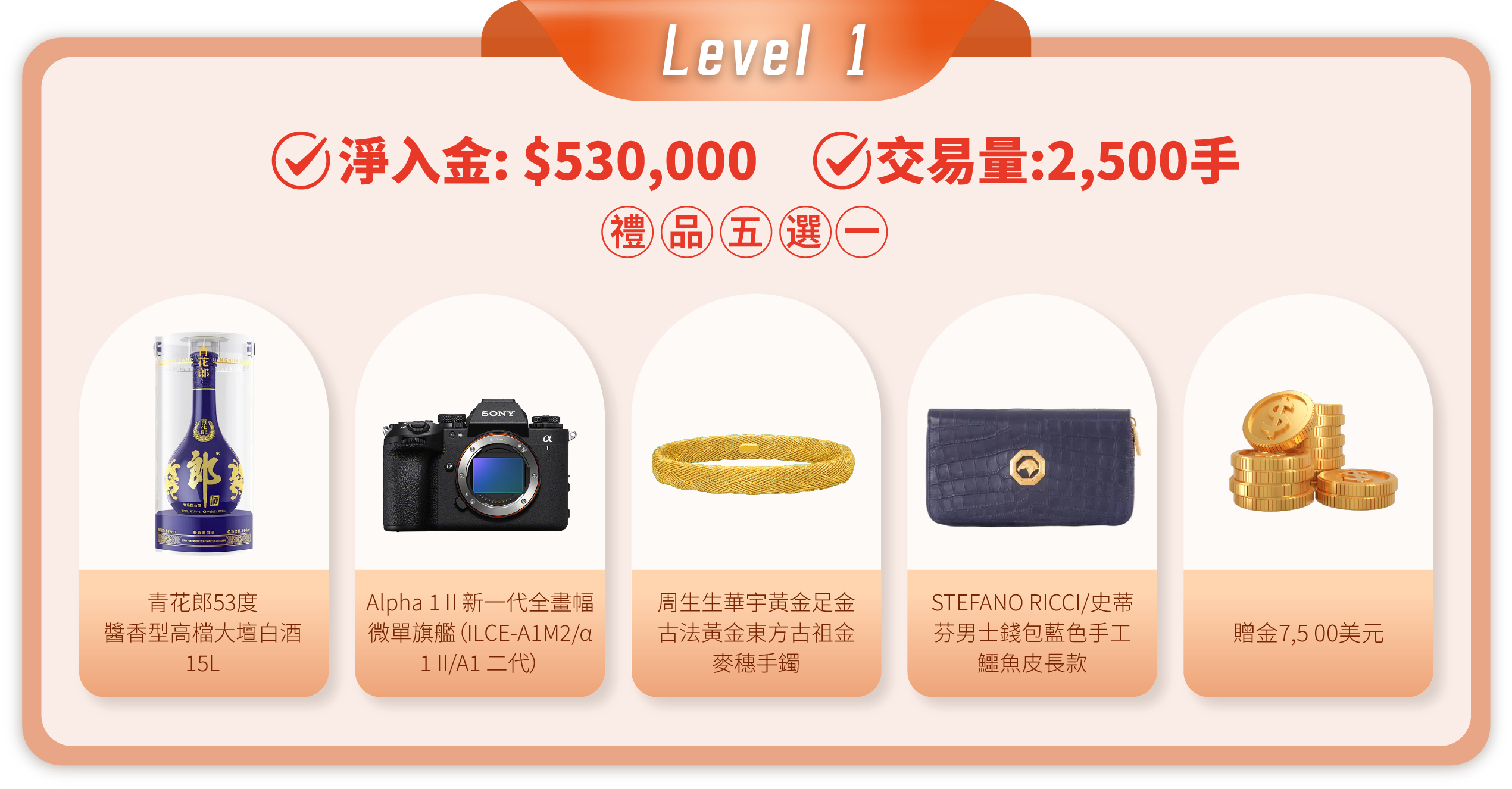 在活動期間內,顧客的淨入金和平倉手數(美股產品不計算在內)達到相應要求,即可在該層級的五件精選禮品中任選其一。層級越高,禮品越豐富!