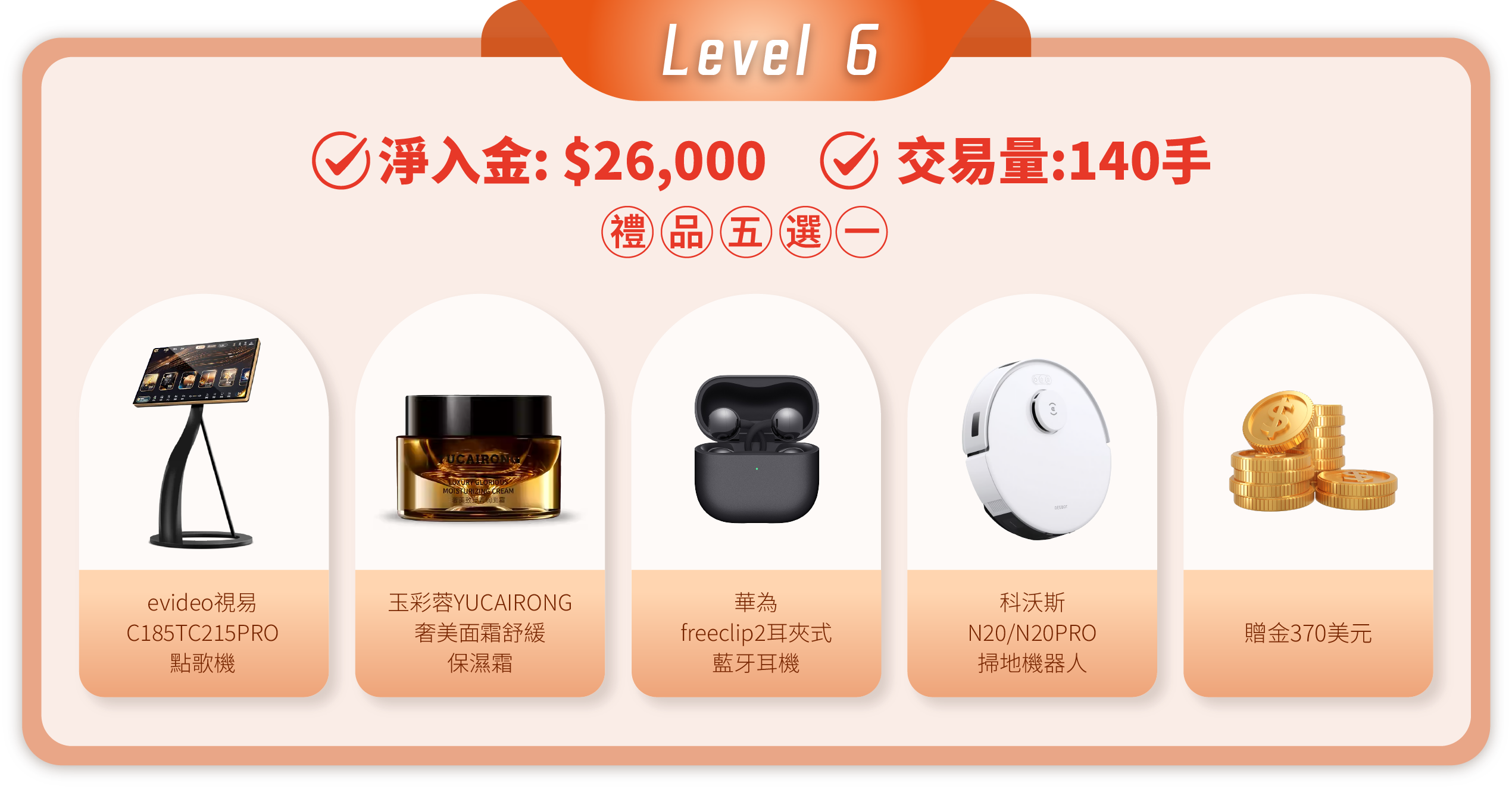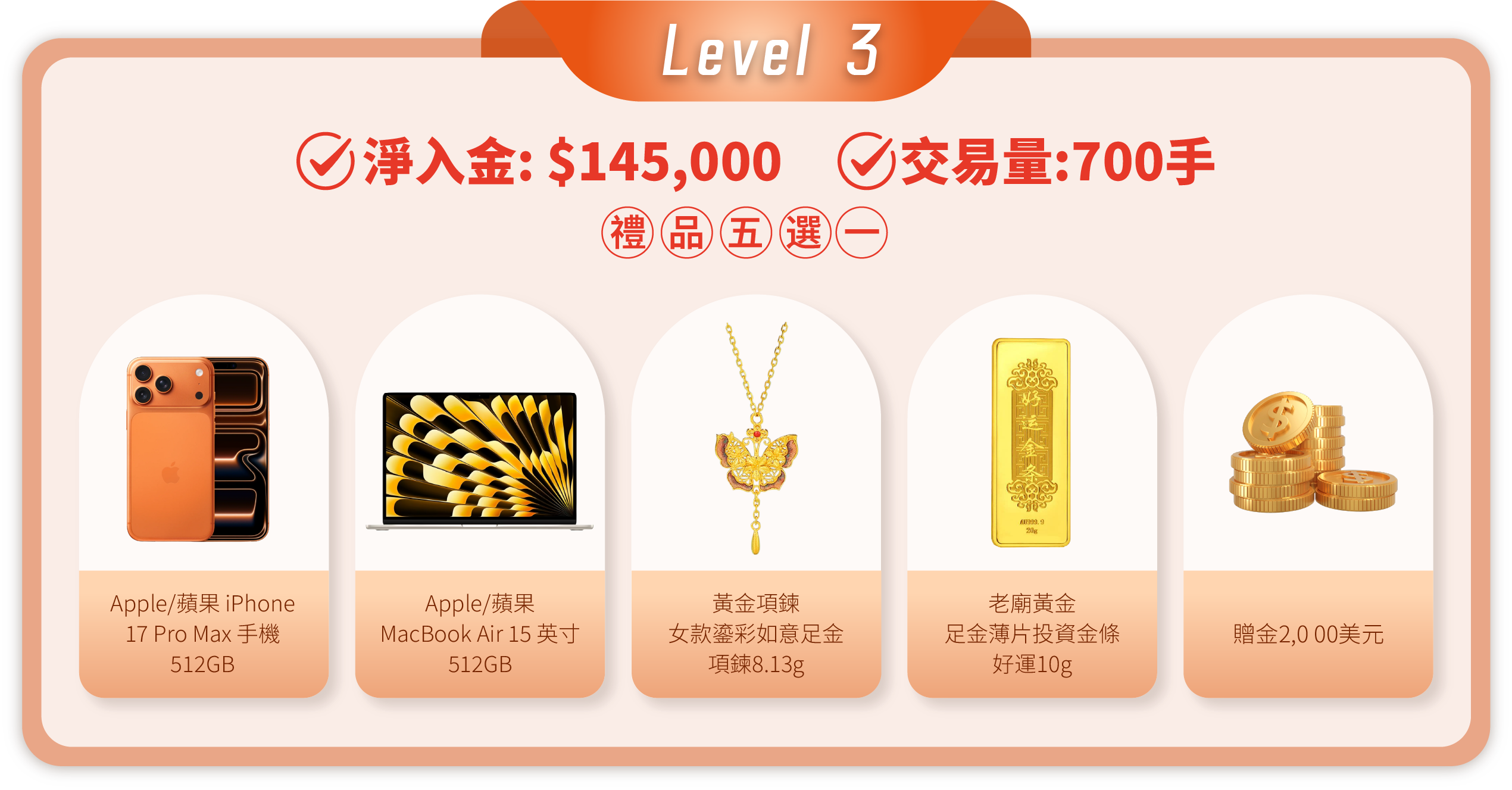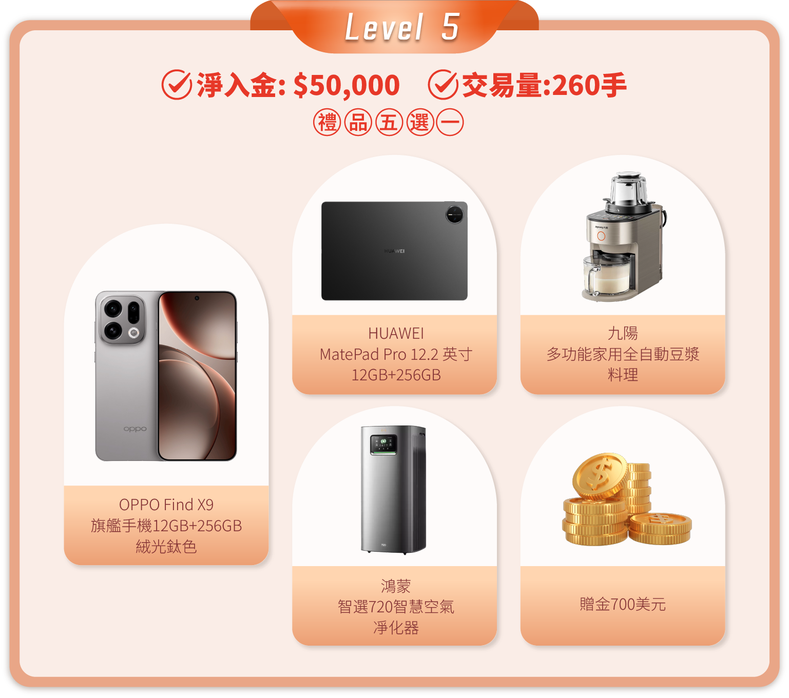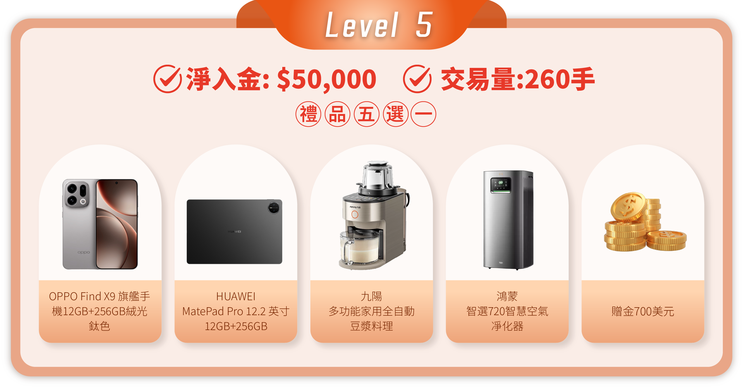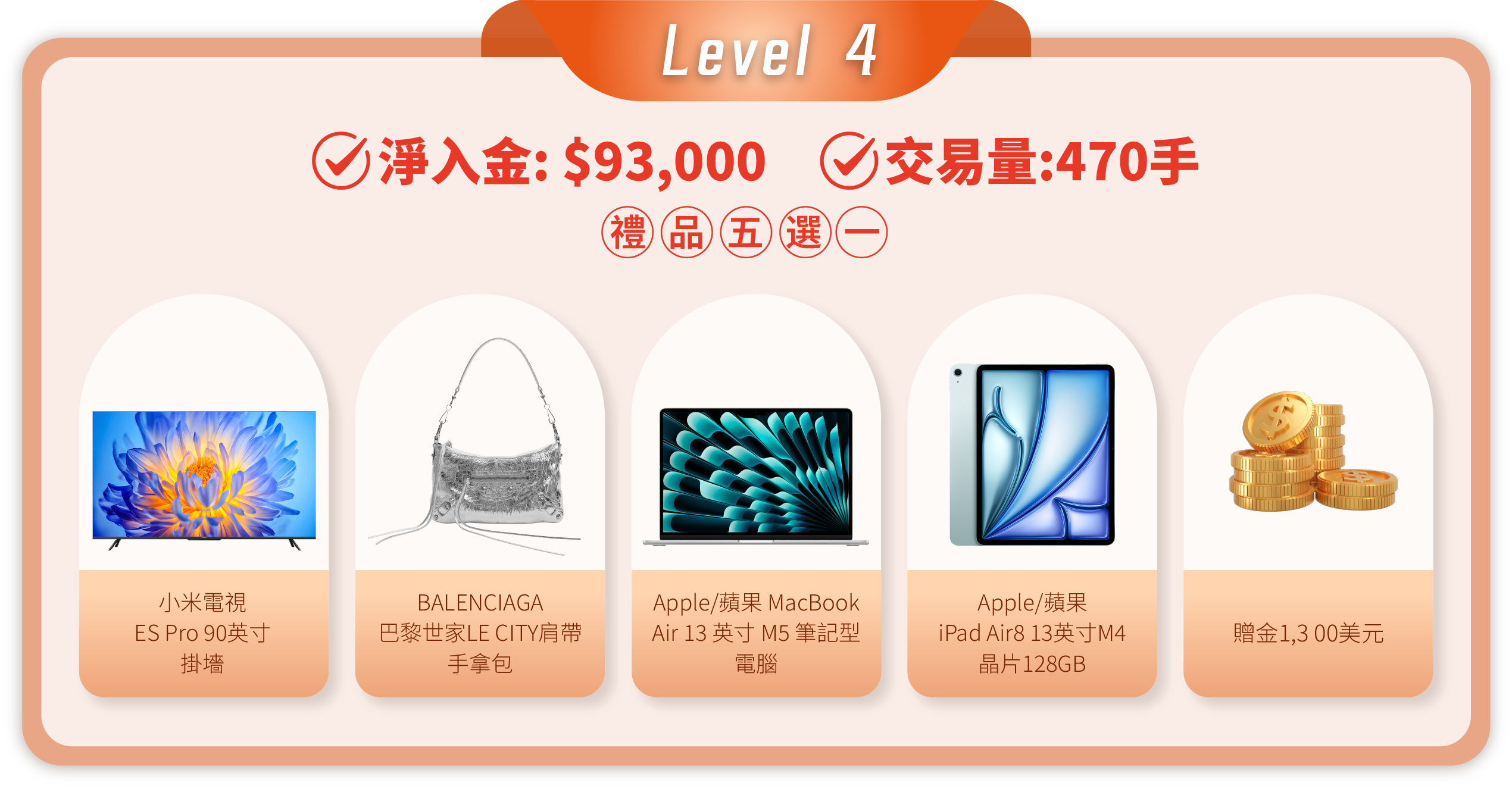 • 活動內容: 客戶在登記活動後,活動期間內的淨入金和平倉手數(美股產品不計算在內)達到相應要求,即可在層級的獎品進行五選一。