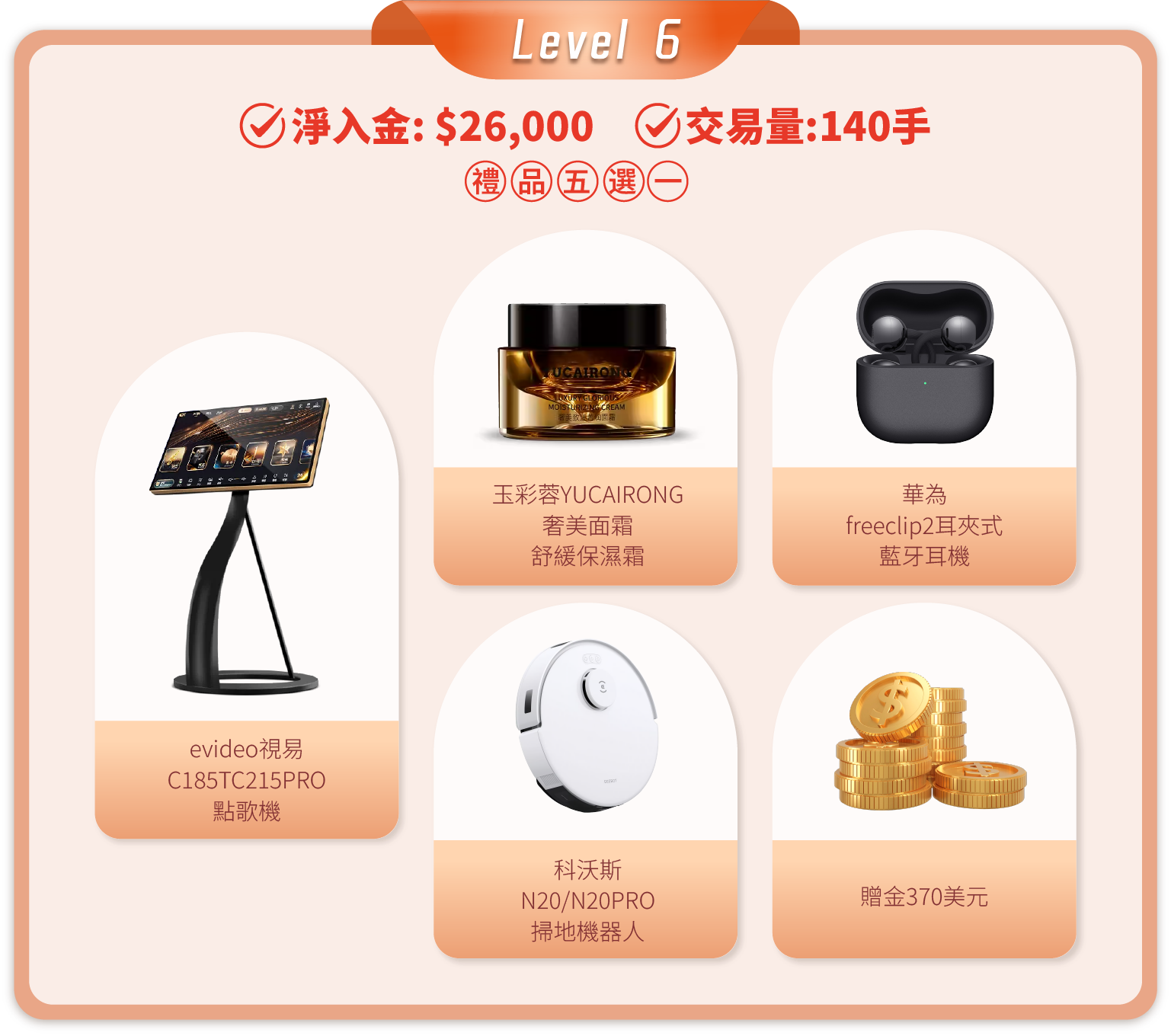 • 活動結束後的獎品發放流程:統計結果後,我們將安排專人聯繫各達標客戶。聯繫時會提供一個表單鏈接給獲獎者填寫。該表單用於收集獎品選擇及收貨資料。達標客戶需在2026年6月20日前提交表單。