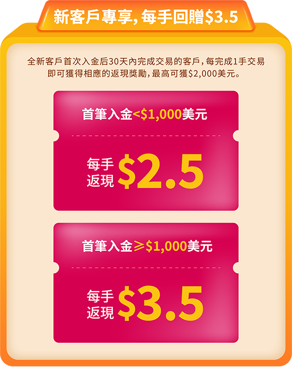 。 首筆入金金額少於$1,000美元的客戶,每手交易返現$2.5美元,最高返現金額為$2,000美元。